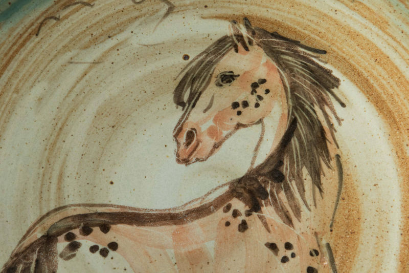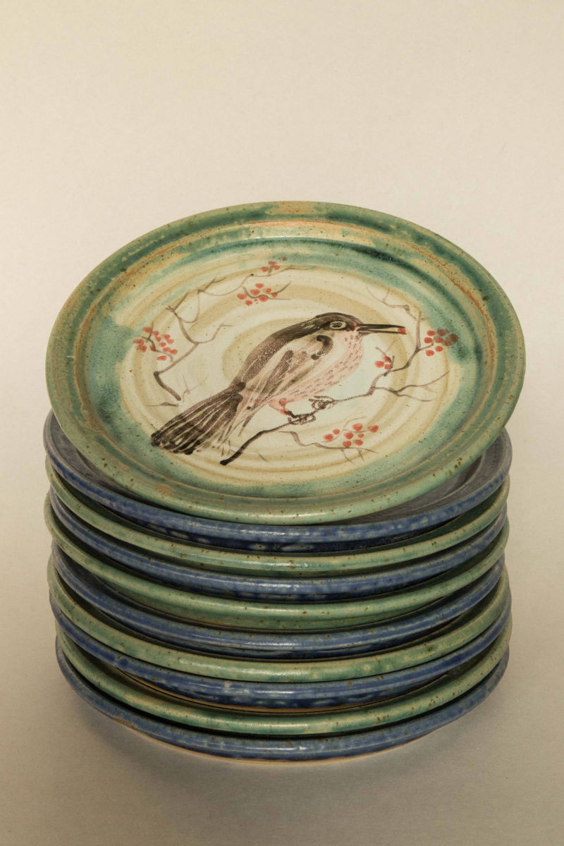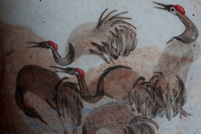 Unsere Dekore gestalten wir mit aufgetragenen farbigen Tonschlicker und Ritztechnik sowie mit feiner Pinselmalerei. Die Motive, etwa Kopfweiden, Schlehenäste oder Kraniche, finden wir in den Landschaften der Region.