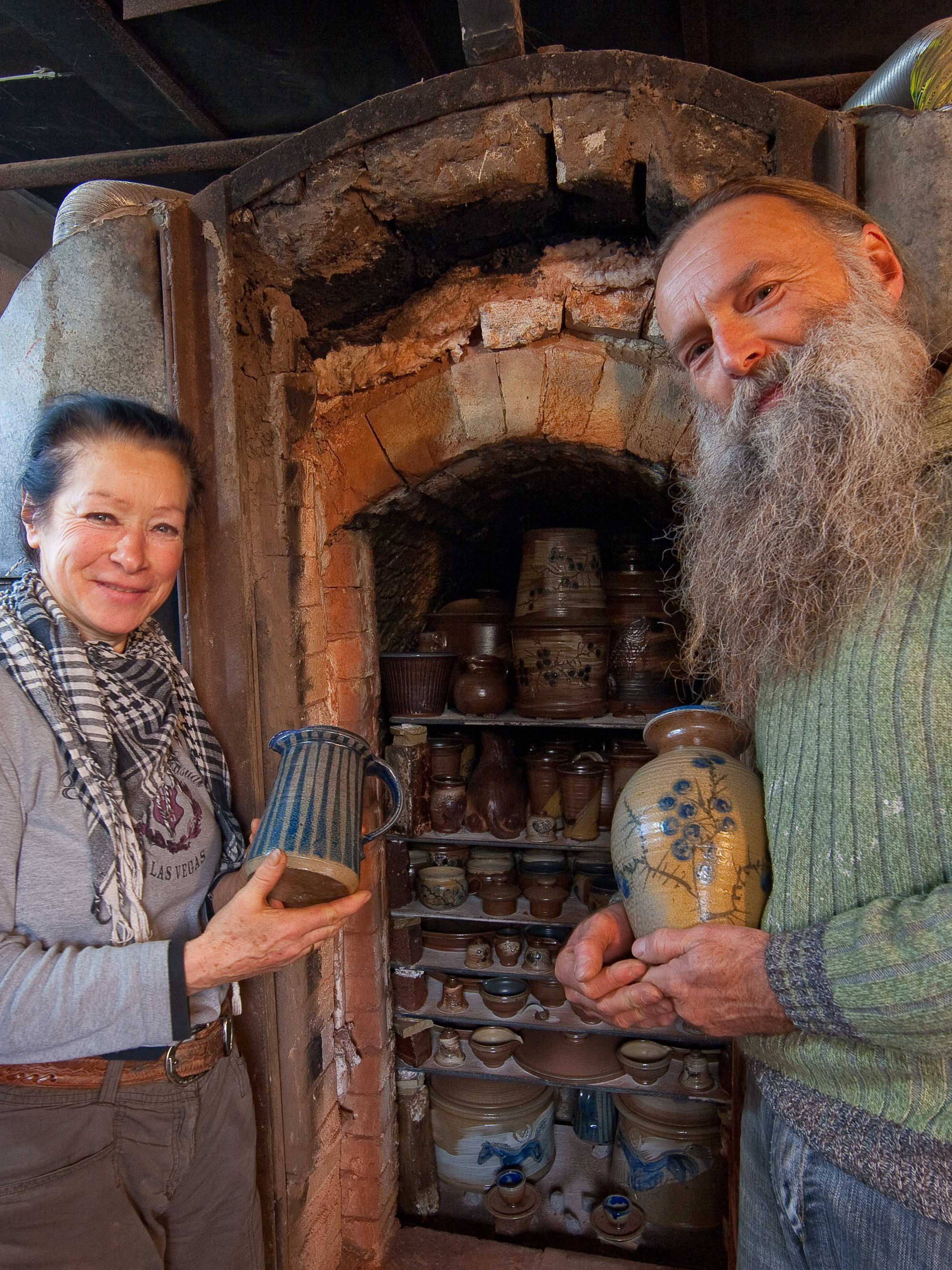 Der Holzbrandofen ist das Herzstück der Töpferei. Je nach Heizintensität wechselt die Ofenatmosphäre von reduzierend bis oxidierend. Der unterschiedliche Sauerstoffgehalt verleiht dem gebrannten Ton graue bis bräunliche Farben. Wenn 1250 °C erreicht sind, schmilzt die Flugasche auf den Gefäßen, der Ton versintert und die Töpfe werden so wasserdicht. Unsere Glasuren dienen also nur der optischen Gestaltung, nicht der Gefäßabdichtung. Auf die Glut geworfenes und sofort verdampfendes Kochsalz bringt zusätzlichen Oberflächenglanz.