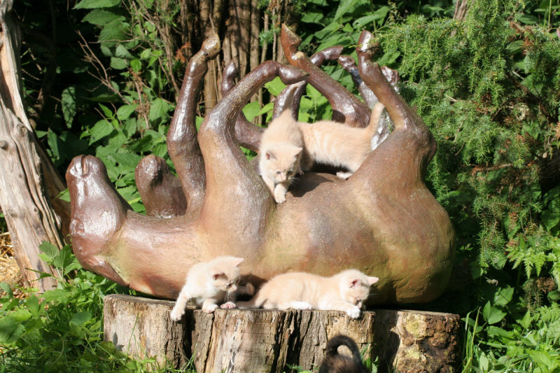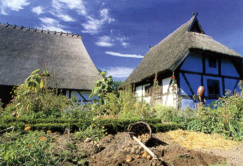 Bauerngarten nach klassischem Vorbild angelegt. Ihn charakterisiert eine kreuzweise Wegführung, die mit Buchsbaum eingefasst ist. Im Schnittpunkt liegt ein blumenbepflanztes Rondell.