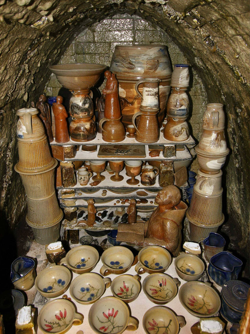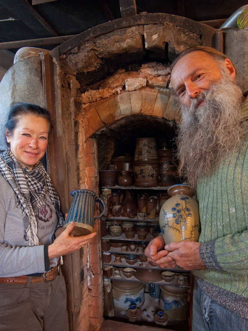 Der Holzbrandofen ist das Herzstück der Töpferei. Je nach Heizintensität wechselt die Ofenatmosphäre von reduzierend bis oxidierend. Der unterschiedliche Sauerstoffgehalt verleiht dem gebrannten Ton graue bis bräunliche Farben. Wenn 1250 °C erreicht sind, schmilzt die Flugasche auf den Gefäßen, der Ton versintert und die Töpfe werden so wasserdicht. Unsere Glasuren dienen also nur der optischen Gestaltung, nicht der Gefäßabdichtung. Auf die Glut geworfenes und sofort verdampfendes Kochsalz bringt zusätzlichen Oberflächenglanz.