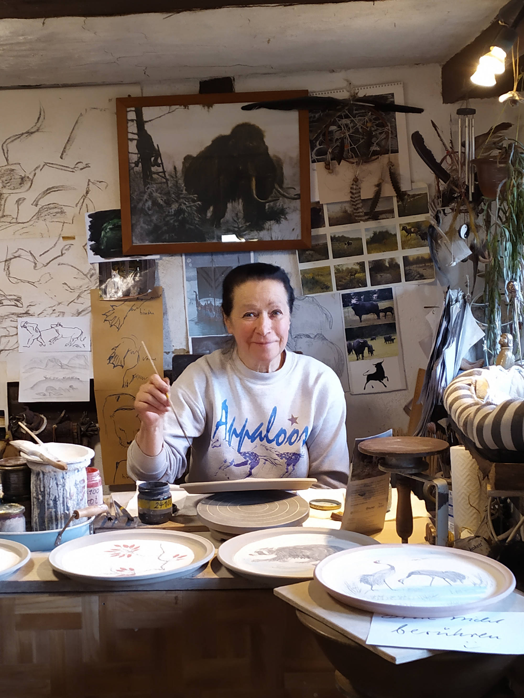 Unsere Dekore gestalten wir mit aufgetragenen farbigen Tonschlicker und Ritztechnik sowie mit feiner Pinselmalerei. Die Motive, etwa Kopfweiden, Schlehenäste oder Kraniche, finden wir in den Landschaften der Region.