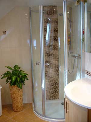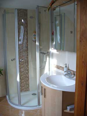| Zu terracotta-farbenen Bodenfliesen wurden hier Mosaikfliesen in Naturtönen gewählt | Die Mosaike finden sich mehrfach im Bad wieder. | Als Eyecatcher wurde die Mosaik-Wand in der Dusche platziert. | Dateil am Waschbecken |
