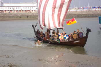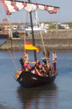 | Das Schiff kommt.. | Sven, der Jarl der Tiuwari springt ins Wasser... |