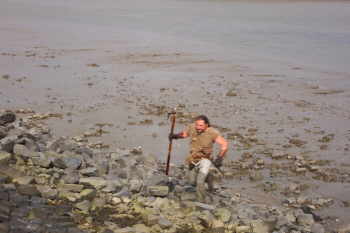 | watet aus dem Schlamm an Land | und kämpft mit Wüti |