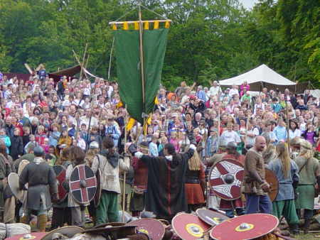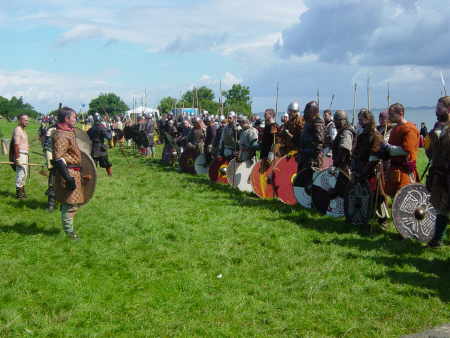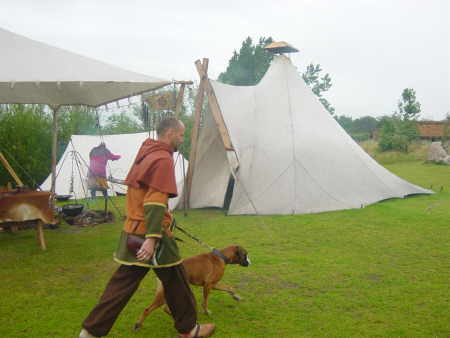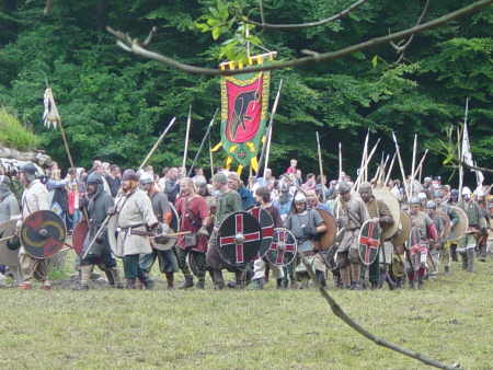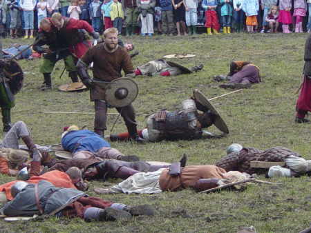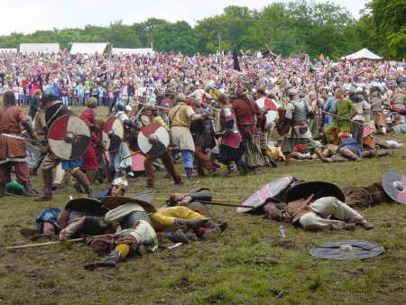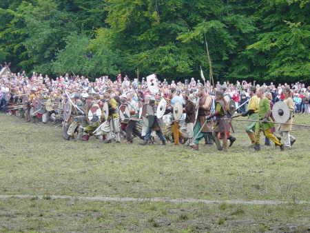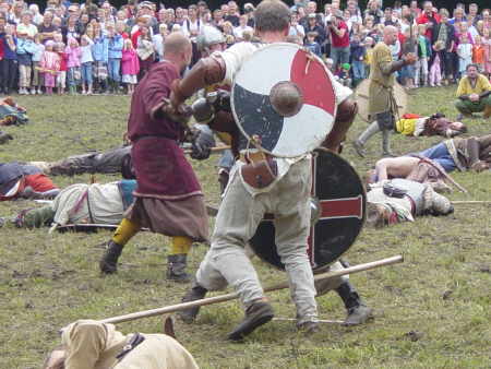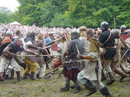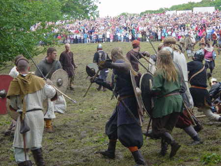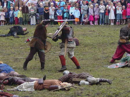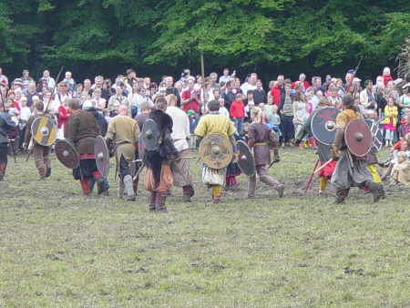 | Die Krieger haben in der Woche fleißig mit am Wall gebaut, sonst wäre er wohl nicht bis zum Sonnabend fertig geworden. Die Schlachten waren gut vorbereitet und publikumswirksam umgesetzt. Leider konnte man ja die dänischen Erklärungen nicht verstehen. |