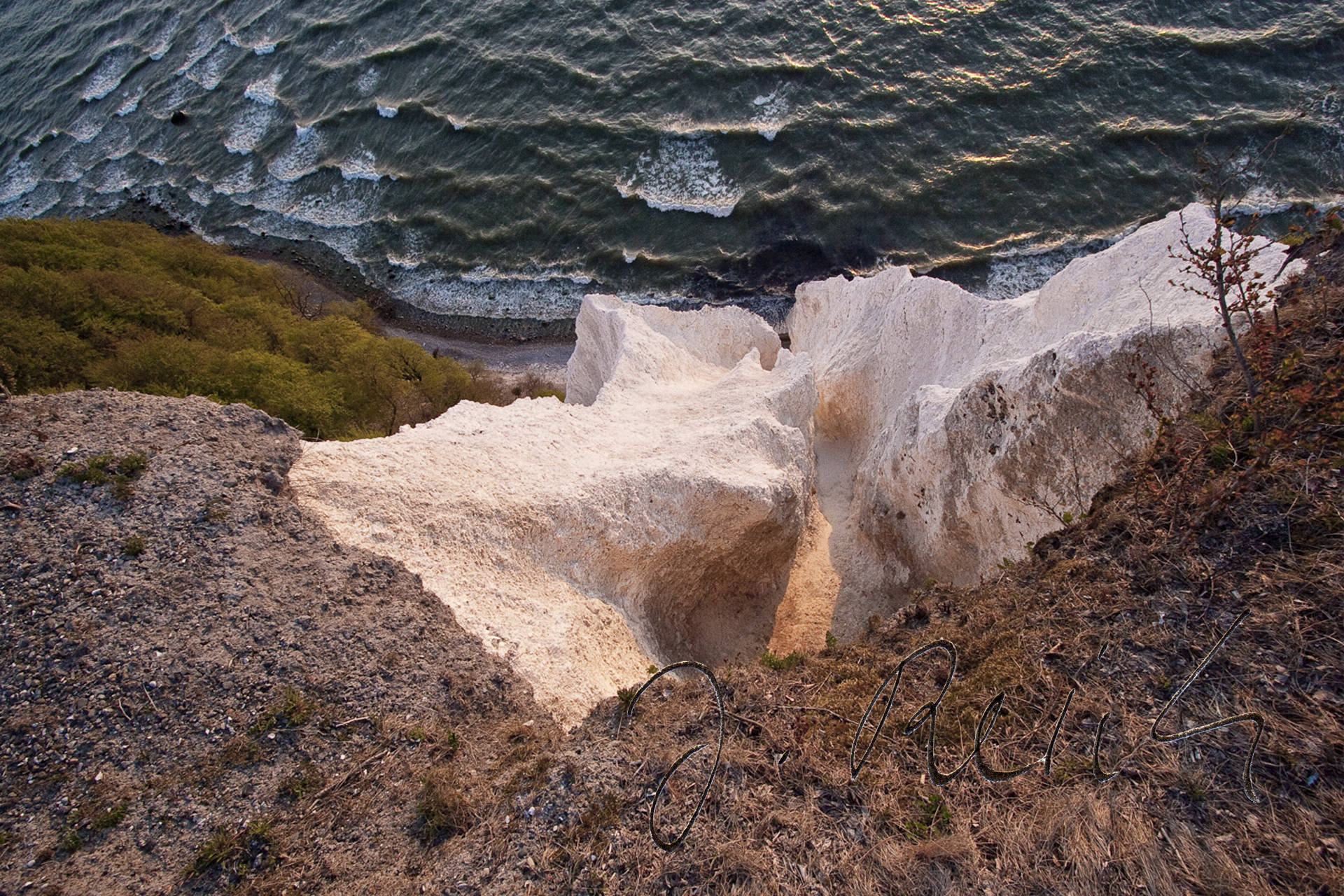 Eingefangen von der Stille gehe ich fast schon bedächtig unter den breiten Kronen auf die deutlich hellere Küste zu. Mit jedem Schritt wird die Sicht besser und unmittelbar an der Steilkante sogar richtig frei. Ein Stück weit zu beiden Seiten ragen Bäume und Kreideklippen aus der Tiefe empor, nur das Meer ist weg! Der Blick schweift über und durch ein völlig gleichförmiges Hellgrau. Egal, ob man ganz nach unten schaut, in die gewohnte Richtung wo sonst die Horizontline zu finden ist oder nach oben, überall das gleiche schmucklose Nebelgrau.