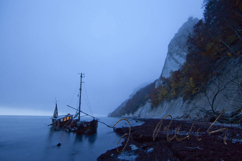 Die Sonne war schon vor zwei Stunden aufgegangen, aber selbst dort, wo sie erfahrungsgemäß stehen müsste, wenigstens als helle Stelle angedeutet, gibt es keinen Unterscheid in der Helligkeit. Eigentlich müsste jetzt die Fähre gar nicht soweit draußen auf der unsichtbaren Wasserstraße mit tiefen Gebrubbel vorbeikommen oder wenigstens ein paar Fischkutter beim Herbstheringsfang vor Saßnitz heran tuckern, aber der Nebel scheint wirklich jeden nur möglichen Laut vollständig zu verschlucken. Zu sehen ist ohnehin da draußen überhaupt nichts. Eine mystische Atmosphäre.