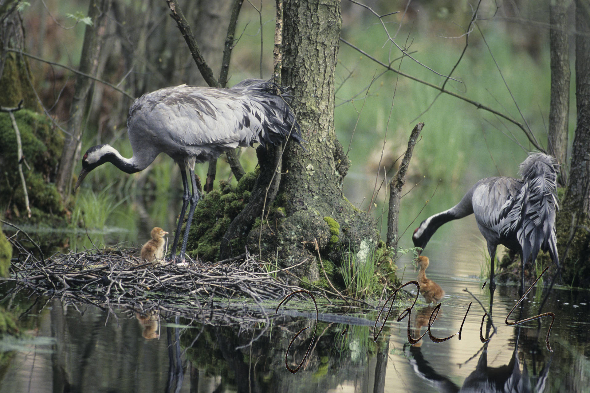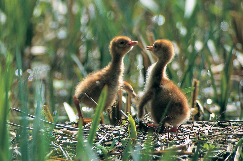 Ich habe mich genauso erschrocken und bin verärgert. Hier entsteht doch nun wirklich kein landwirtschaftlicher Schaden! Der Fahrer holt nun die Rinder zusammen und treibt sie mit dem Traktor vom Feld. Außer ein paar Mäusen bin ich jetzt wohl das einzige Lebewesen auf dem Acker. Was tun? Eine ganze Weile sitze ich da und grübele. Doch da, schon wieder etwas von hinten, ein Rauschen über mir und schon steht eine Kranichfamilie mit zwei Jungen vor dem Objektiv. Ich kann es kaum fassen. Noch sind die Hälse lang gestreckt und alle sichern. Aber schon bald beginnen die arglosen Jungvögel den ausgelegten Mais zu fressen. Jetzt erst wage ich, das Objektiv optimal einzurichten um endlich die ersten Fotos zu machen. Und da geht es schon weiter. Ein Flug nach dem anderen landet jetzt hier und ich belichte einen Film nach dem anderen. Das ist ein Fototag!
