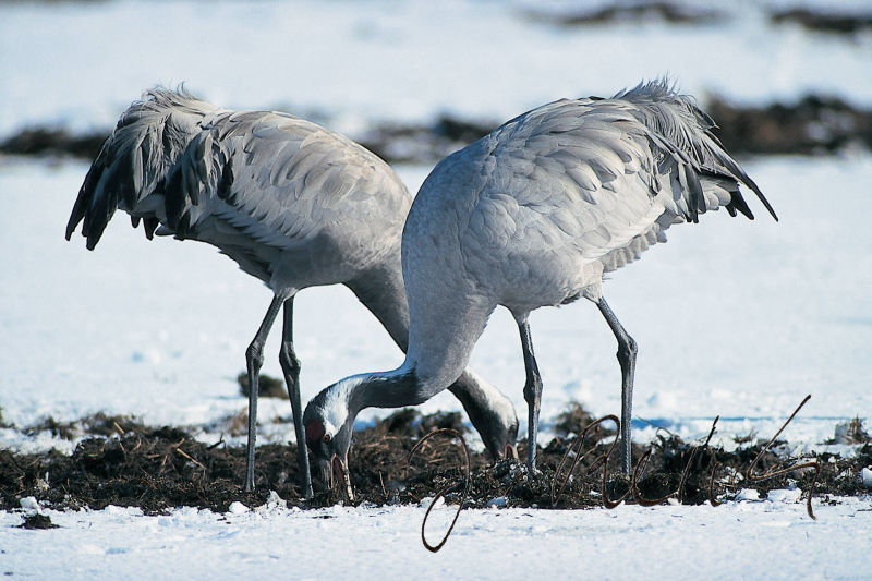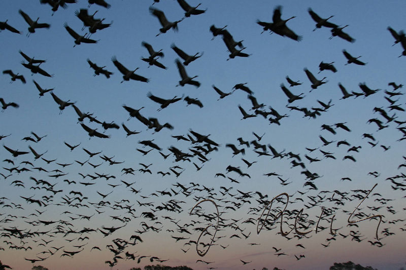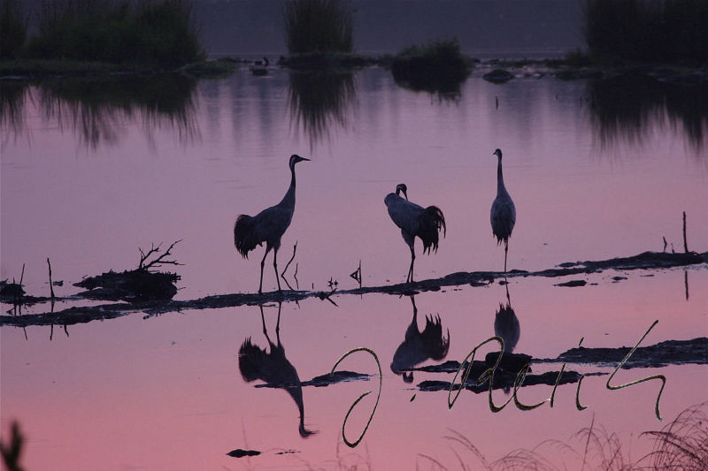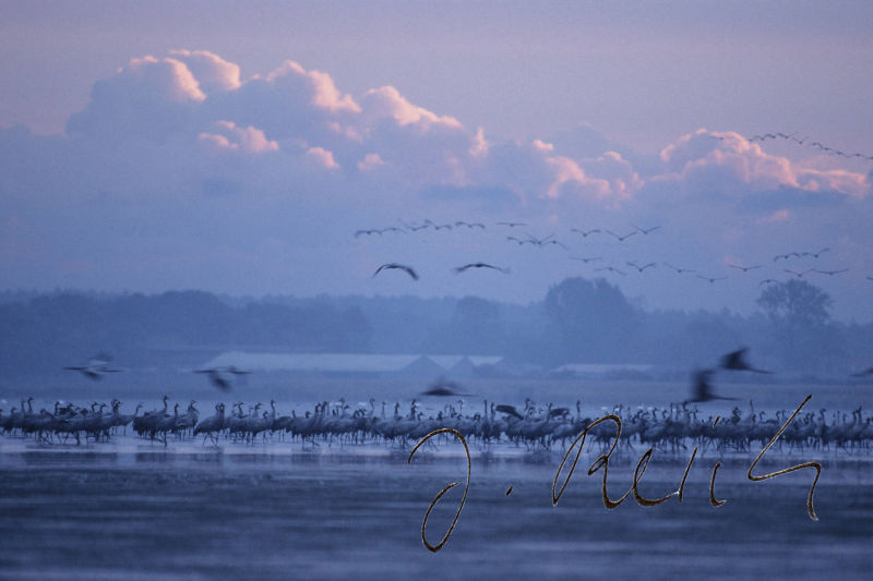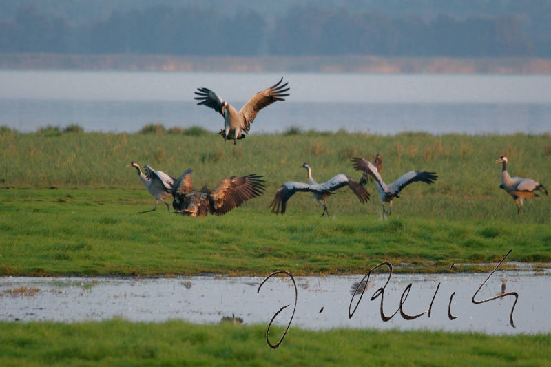 Aber was ist das? Schnauben, Brummen und Tritte. Kommen jetzt noch Wildschweine? Ein Blick nach hinten, o nein, viel größer, zahlreicher und bunter: Kühe. Erst einmal benutzen sie die Kanzel als Scheuerpfahl und alles schwankt. Ich muss das Stativ mit der teuren Fototechnik darauf festhalten. Eine Kuh nach der anderen kommt zur Kanzel. Zum Glück juckt nicht jeder das Fell - es sind wohl über fünfzig! Nun geht es in Richtung Vogelschwärme. Viele Kraniche, die in Skandinavien oder in der nördlichen Taiga brüten, kennen zwar Wölfe, Elche und Bären, aber keine Kühe. Die Vögel weichen trotzdem nur kurz aus. Kühe und Wildvögel vertragen sich gut und so langsam kommen die Kraniche auch näher. Doch was ist das? Ein Geräusch, das anfänglich zum Hintergrund gehörte, wird immer deutlicher, dann richtig zudringlich. Ein uralter Traktor kommt laut und qualmend heran, fährt an der Kanzel vorbei und auf die Kühe und Kraniche zu. Außer den Kühen geht nun alles hoch und fliegt aber erstaunlicherweise nicht weit weg. Sie kennen den Traktor wohl schon. Doch was ist das? Der Traktorist steigt aus, hält einen Arm hoch, Schüsse fallen. Alle Kraniche und Gänse fliegen auf.