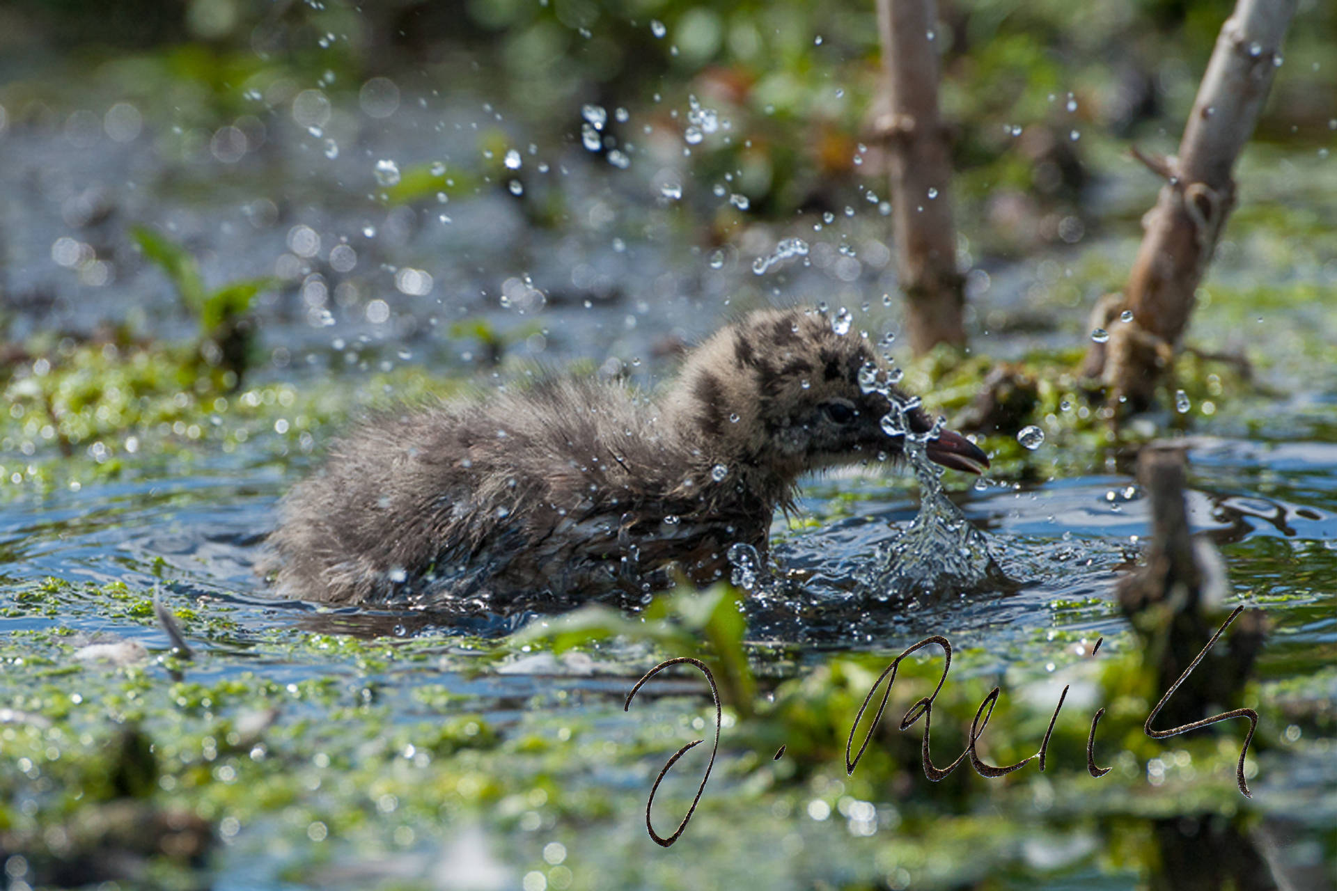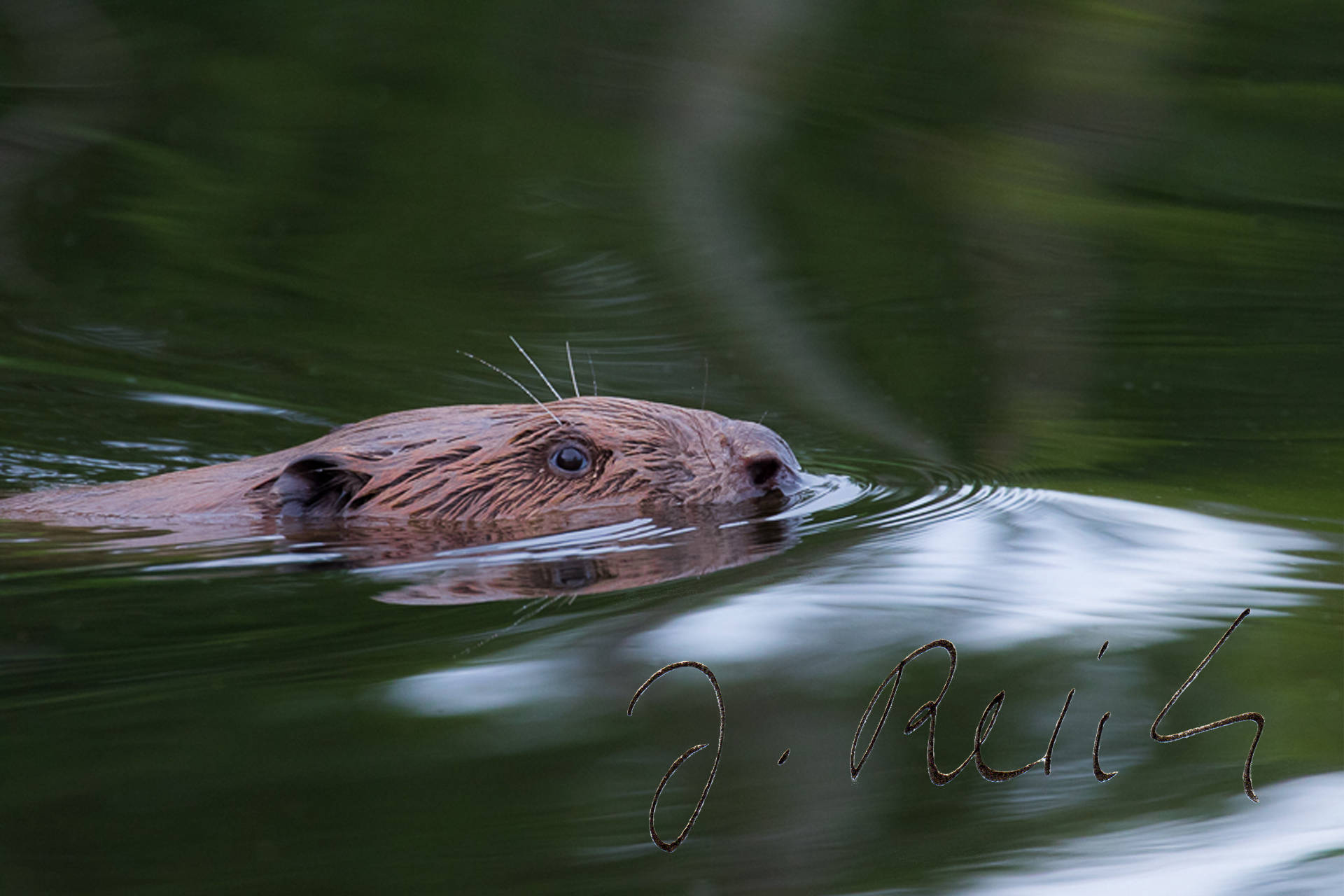 Glücklicherweise verrät uns die aufsteigende Luftblasenspur unter dem Boot hindurch seinen verborgenen Unterwasserweg. Zwanzig Meter seitlich, fast Fluss mittig, taucht er auf, verharrt still auf dem Wasser liegend. Ein einziger lautloser Ruderschlag dreht den Kanadier, bis sein Bug auf das Tier zuhält. Zu unserer Überraschung steuert nun auch der Biber direkt auf uns zu! Der Abstand wird kleiner und kleiner bis ich, hinten im Heck sitzend, den flachen braunen Kopf mit den runden, schwarzen Knopfaugen nicht mehr sehen kann. Nur meine Frau hat noch freie Sicht auf das, was sich vor unserem Bug tut. Jeden Moment müsste der Biber ganz nah links oder rechts seitlich vom Boot auftauchen oder wieder unter Wasser verschwinden. Doch da klatscht es urplötzlich laut, und eine Fontäne Wasser schießt meiner Frau ins Gesicht. Weg ist der Biber!
