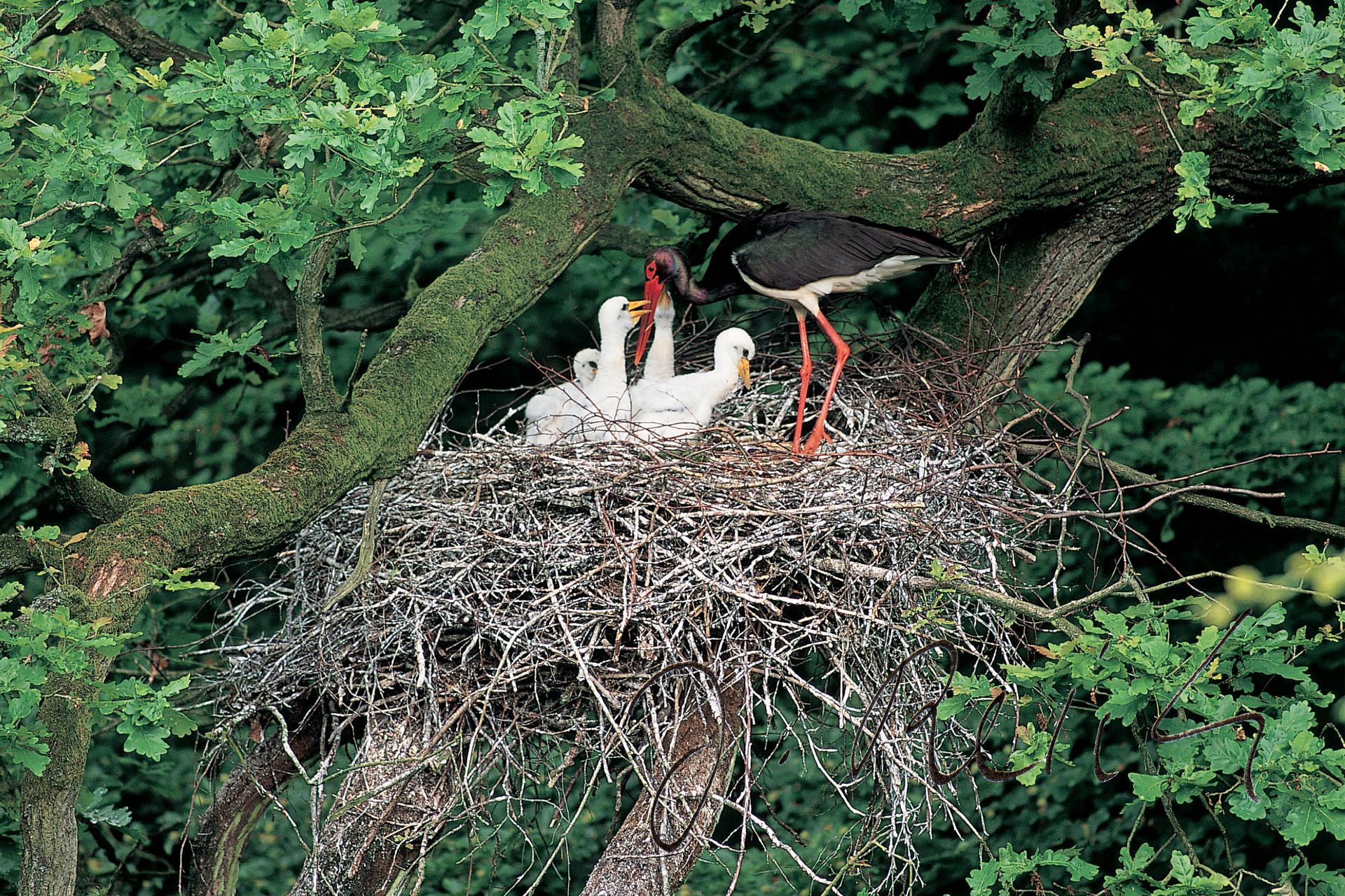 Mir war es unheimlich, als ich vor drei Wochen mit einem Beringer auf den Mast klettern durfte. So dicht zwischen den Adern der 110 KV-Leitung in dreißig Meter Höhe steigen … , nur nicht nach unten schauen und nur die Bewegungen machen, die der Experte über mir tat! Gründlich belehrt, ausgestattet mit Sicherungsseil und Helm habe ich bestimmt keine so professionelle Figur abgegeben wie mein Begleiter, der schon seit zwanzig Jahren Fischadler beringt. So ganz nebenbei wollte ich dort oben noch fotografieren. Die ruhigen Bewegungen und das entspannte Gesicht meines Gegenübers halfen mir sehr, die ungewohnte Situation zu meistern. Sogar ein freihändiger Filmwechsel gelang während des Beringens der drei Jungadler! Sie lagen in Schockstarre platt und mit aufgerissenem Schnabel tief in die Nestmulde gedrückt. Das Ringanlegen war unspektakulär: Ein Bein bekam den Metallring mit einer Seriennummer und der Anschrift der Vogelwarte, und nach kurzem Griff erhielt das andere den Farbring mit einer von weitem ablesbaren Buchstaben-Zahlenkombination.