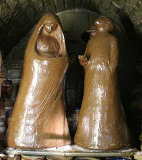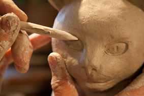 Im Wechselspiel von Antrocknen lassen und weiterem Aufbau entstehen Plastiken die sehr häufig eine Tier-Mensch-Beziehung darstellen.