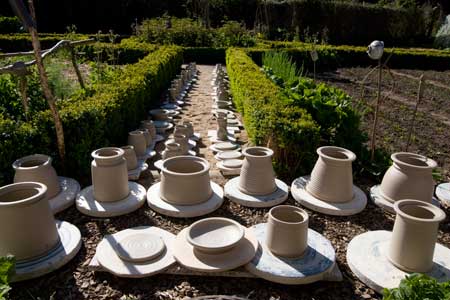 Unsere Töpferei ist eine der wenigen Werkstätten, die noch eine eigene Tonaufbereitung hat. Wir verwenden überwiegend Frohnsdorfer Ton aus der Nähe von Chemnitz. Er wird kostengünstig, wie er aus der Grube kommt, geliefert. Durch die Arten der geologischen Ablagerung gibt es Stücke von sehr fett bis sandig. In der Sumpfgrube liegt er oft jahrelang, sommert und wintert aus und verbessert so seine Plastizität. Auch Westerwälder Tone werden verarbeitet.