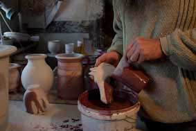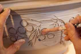 Haben die gedrehten Gefäße ihren "lederharten" Zustand nach 1 bis 2 Tagen erreicht, werden sie häufig durch aufgetragenen farbigen Tonschlicker und Ritztechnik dekoriert.