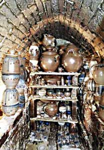 Nachdem die vorgeschrühten Töpfe in den Einbauregalen stehen, oder übereinandergestapelt die Ofenecken ausfüllen, beginnt der Brand. Achzehn Stunden lang ist der Ton den Flammen ausgesetzt.