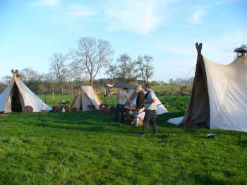 | Wir haben Freitag nachmittag aufgebaut, da war schon der Techno-Kelte da und freute sich ein Loch in A...., dass ich vegetarisch kochen wollte. Der Abend verging mit Begrüßungen und ein wenig Unterhaltung sehr schnell. Es war angenehm warm, in der Nacht wurde es dann aber doch so frisch, dass am Morgen die Wiese weiß überzogen war. Wie immer waren wir die ersten, Thorhall ist allerdings auch schon am Start gewesen. Tja und dann das Übliche - warten auf das kochende Wasser für den Kaffee. |