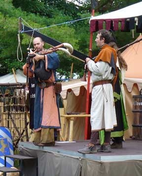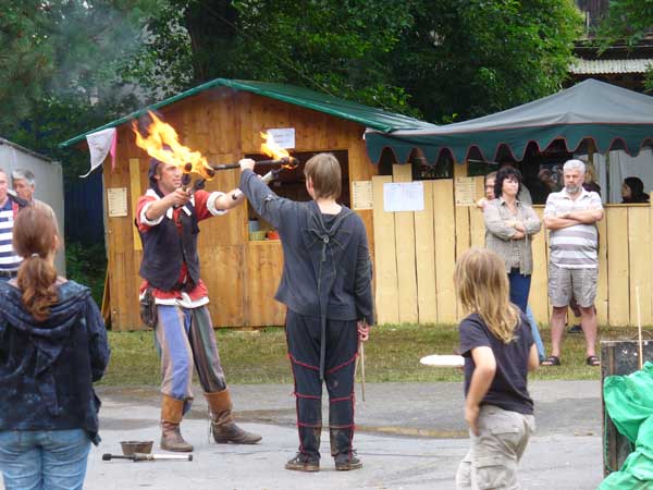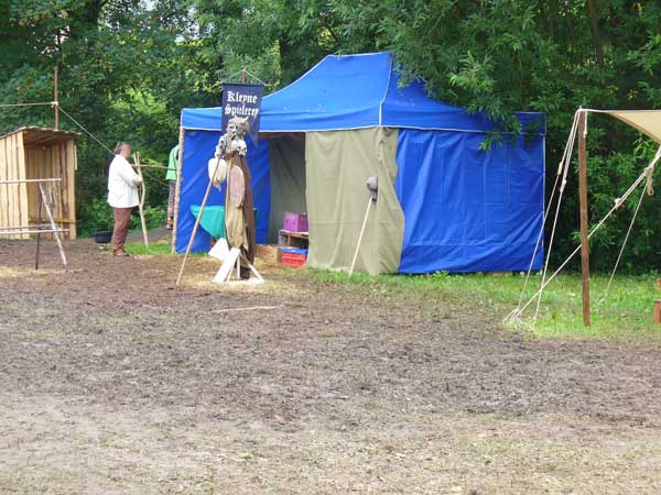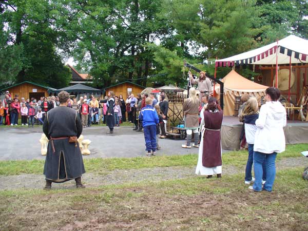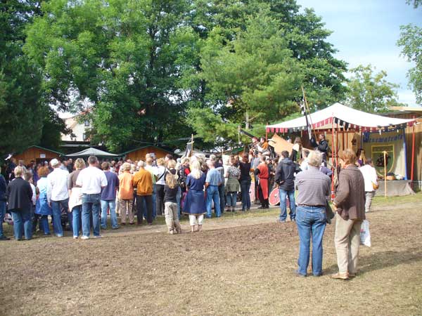 Also der Aufbau war noch sonnig, aber leider entwickelte es sich so, dass man in Zukunft vom Markt in Schlammbach-Dietharz im Thüringer Regenwald sprechen wird. Nichts destotrotz waren die Besucher in Scharen gekommen um sich nichts vom schönen und vor allem sehr lustigen Programm entgehen zu lassen. Hervorzuheben ist vor allem der 9-Kampf, der sehr spaßig ist.