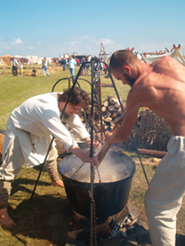 ![]() Uwe und mein Sohn Clemens kämpfen hier mit dem Riesenkessel bzw. dem Inhalt in Norddeich 2004. Clemens ist seitdem immer mal dabei. |