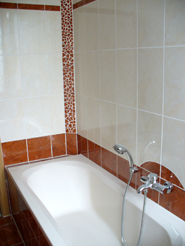 | Die dunkelroten Fliesen lassen die weiße Sanitärkeramik perfekt erstrahlen. Die Verfugung in strahlendem weiß unterstreicht das noch. | Als Eyecatcher wurde die Ecke hinter der Wanne mit einem Mosaik versehen. Ein schönes Detail ist auch der Bogen über der Wannenarmatur. | Der Blick zum Fenster zeigt noch einmal die Anordnung im Bad. Die Waschmaschine wird hinter der Wanne stehen. | |