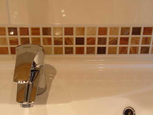 | Zu terracotta-farbenen Bodenfliesen wurden hier Mosaikfliesen in Naturtönen gewählt | Die Mosaike finden sich mehrfach im Bad wieder. | Als Eyecatcher wurde die Mosaik-Wand in der Dusche platziert. | Dateil am Waschbecken |