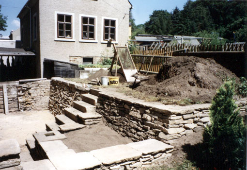 | Der kleine Innenhof hatte noch ein altes Waschhaus und Schuppen, die ihn völlig dunkel machten. | Die Schuppen wurden abgerissen | Dort wo noch vor kurzem die Schuppen standen, ist nun ein Hochbeet durch eine massive Steintreppe zu erreichen. | Die Trockenmauer wartet nun darauf bepflanzt und begrünt zu werden, der Blick zu den Nachbarn ist nun unverstellt und es ist ein heller Hinterhof entstanden, der zum verweilen einlädt. |